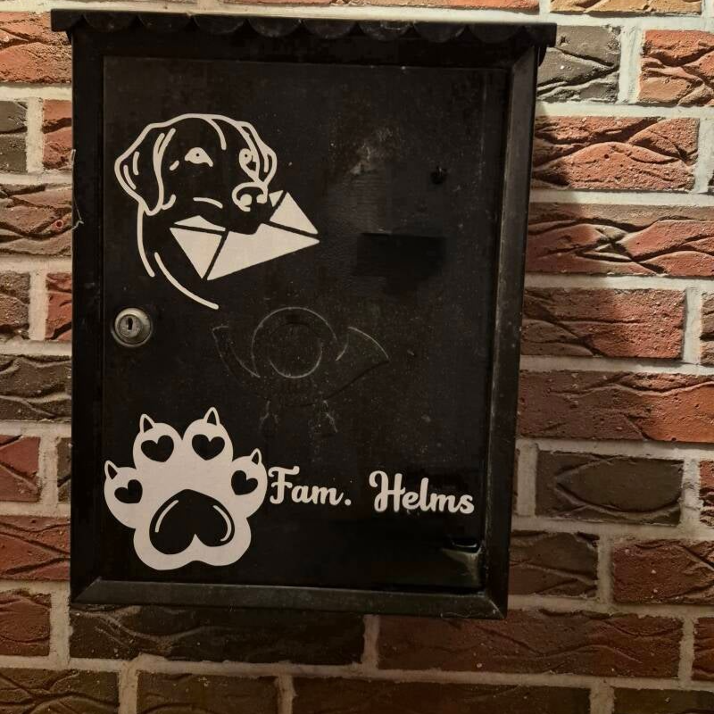 (Die Abbildung zeigt das Foto eines Kunden, der damit seinen schon etwas in die Jahre gekommenen Briefkasten ein wenig aufgehübscht hat. Die beiden anderen Aufkleber auf dem Briefkasten sind sowohl einzeln: Hier gehts zum Pfotenabdruck und Hier gehts zum Namenszug – als auch als 3-teiliges Set erhältlich: für das Set bitte hier klicken)
